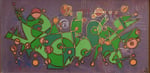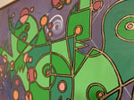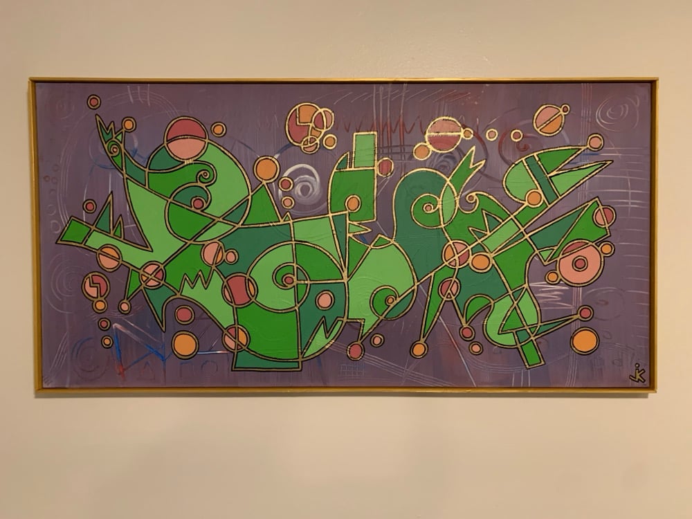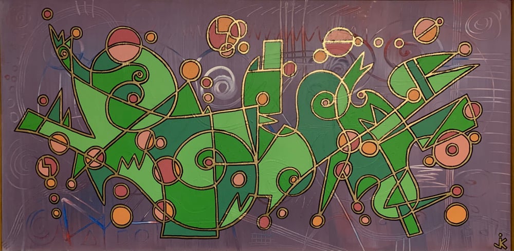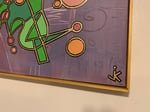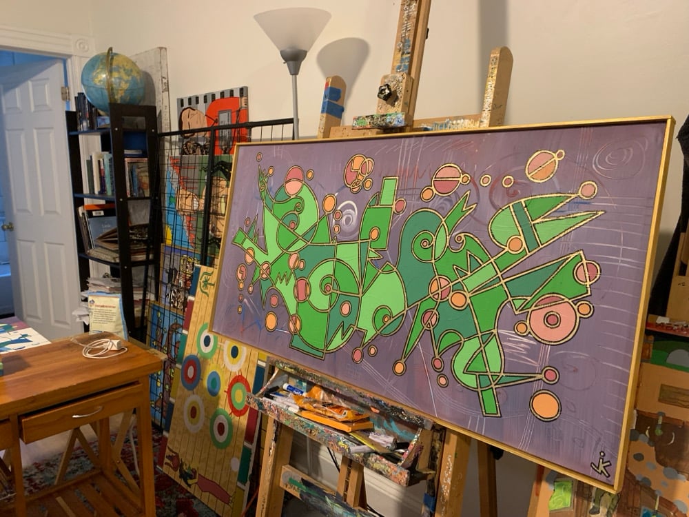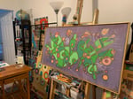 “Lovely” is a 4x2-foot original painting (acrylic + marker) by Josef Kardell. Gold wooden frame. Wire on back, ready to hang. September 2025.